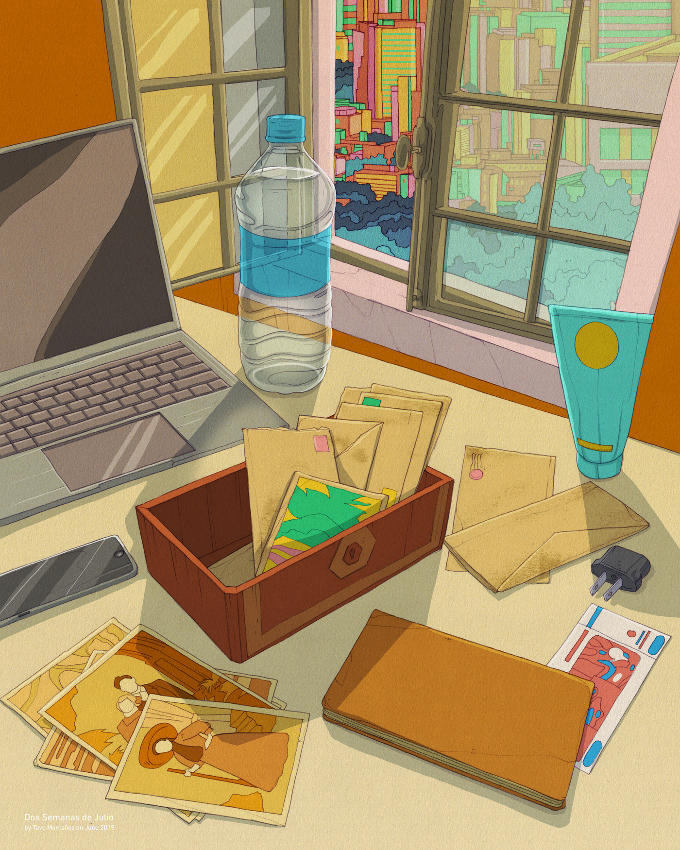 In this year's story, Daniel, a travels to Mexico to work. But he finds a box of old letters and diaries and decides to look for the right owner. I was asked through the editor Åsa Gustafsson to prepare a set of illustrations for the story of Daniel in this year 9 of "Dos Semanas de Julio". Here is the cover illustration and the full set for this publication. All the illustrations are original pencil drawings on paper remastered and colored in Adobe Photoshop with Wacom Cintiq.
